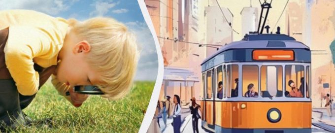 Das Bild zeigt eine belebte Straße, auf der Menschen gehen und eine Straßenbahn fährt. Du musst einen Timer auf fünf Sekunden einstellen und den Fehler finden, bevor die Zeit abgelaufen ist. Sind Sie bereit?