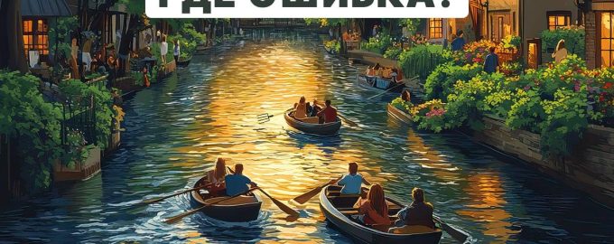 Vor Ihnen liegt ein Bild, das eine schöne Landschaft einer abendlichen Stadt zeigt. Zwischen den Häusern fließt ein Fluss, auf dem Menschen in Booten schwimmen. Auf den ersten Blick scheint das Bild normal zu sein, aber in Wirklichkeit enthält es einen groben Fehler.